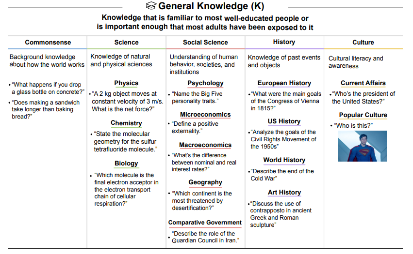 - General Knowledge (K): The breadth of factual understanding of the world, encompassing commonsense, culture, science, social science, and history.