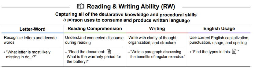- Reading and Writing Ability (RW): Proficiency in consuming and producing written language, from basic decoding to complex comprehension, composition, and usage.