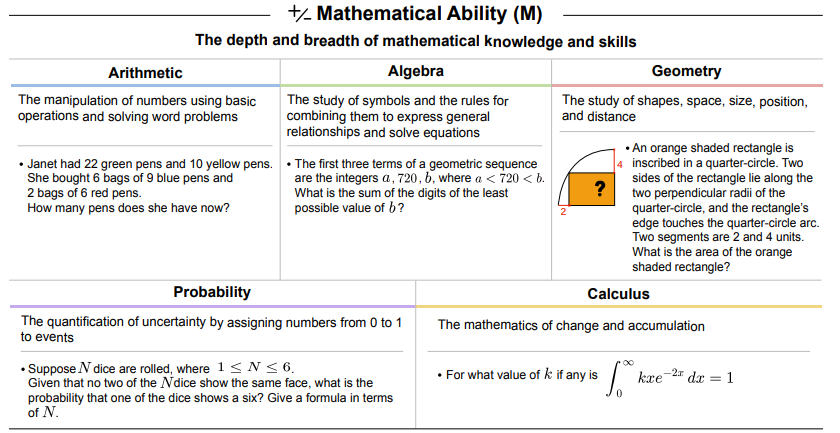- Mathematical Ability (M): The depth of mathematical knowledge and skills across arithmetic, algebra, geometry, probability, and calculus.