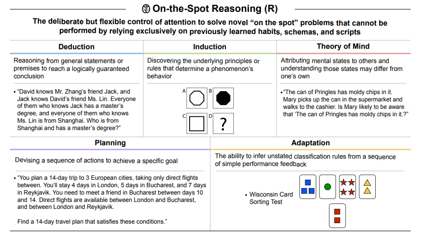 - The machine learning community’s ARC-AGI Challenge aiming to measure abstract reasoning is represented in On-the-Spot Reasoning (R) tasks.