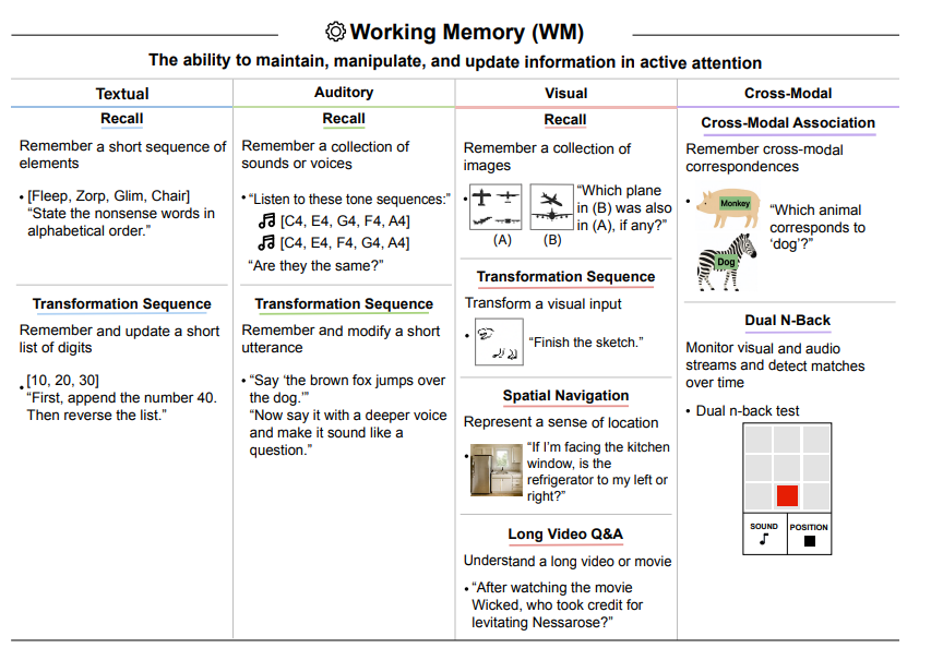 - Working Memory (WM): The ability to maintain and manipulate information in active attention across textual, auditory, and visual modalities.