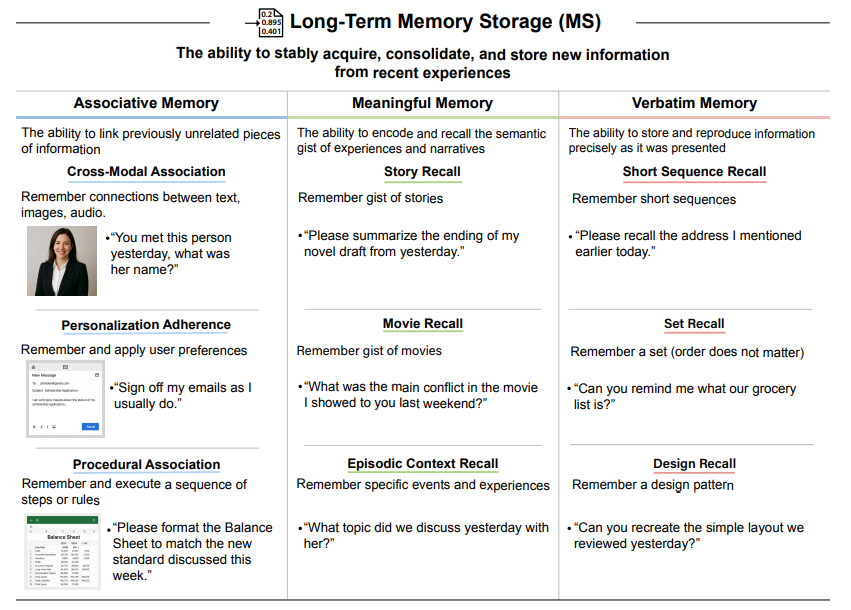 - Long-Term Memory Storage (MS): The capability to continually learn new information (associative, meaningful, and verbatim).