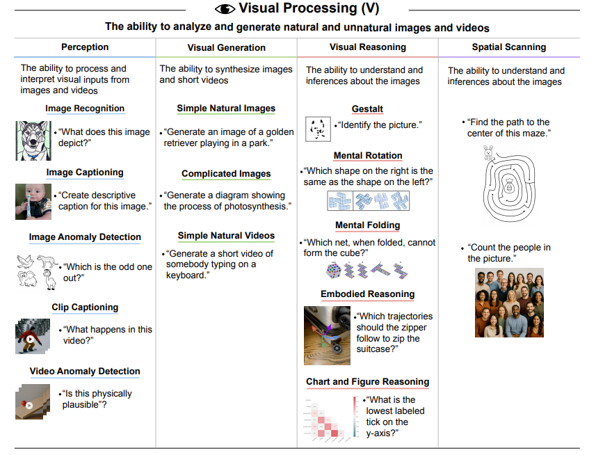 - Visual Processing (V): The ability to perceive, analyze, reason about, generate, and scan visual information.
