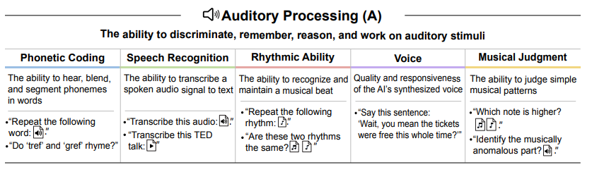- Auditory Processing (A): The capacity to discriminate, recognize, and work creatively with auditory stimuli, including speech, rhythm, and music.