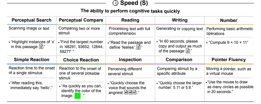 - Speed (S): The ability to perform simple cognitive tasks quickly, encompassing perceptual speed, reaction times, and processing fluency.