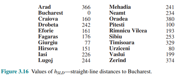 Applied to the route-finding problem in Romania, we compute first the straight-line distance heuristic called
