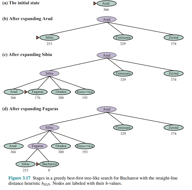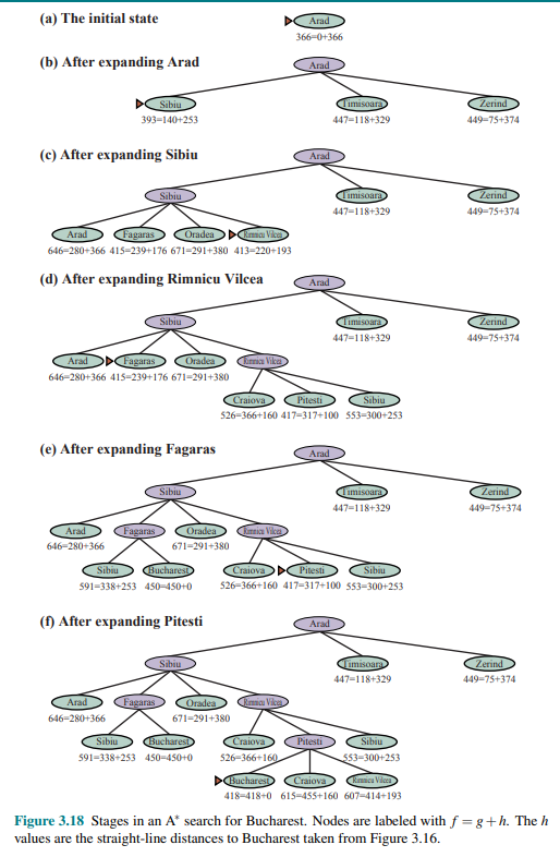 Notice that at step (e), Bucharest appears on the frontier with a cost of 450, however the algorithm does not select it because there is a possibility that going through Pitesti, whose cost is as low as 417, a better solution would be find. In fact, at step (f), After Pitesti Bucharest is selected as the lowest at