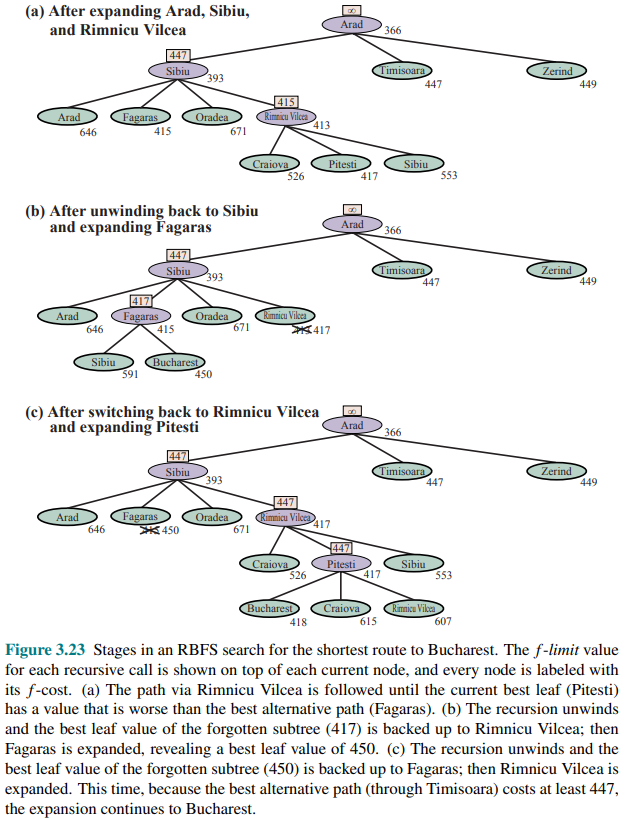 And in the following one, stages of a RBFS search for the shortest route to Bucharest.