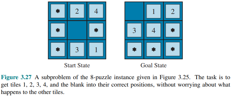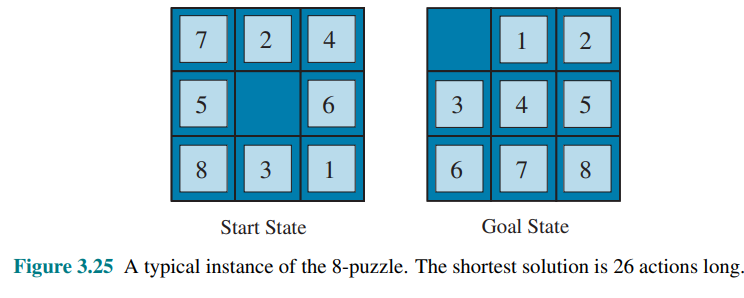 is admissible because any tile that is out of place will require at least one move to get it to the right place. is the sum of the distances of the tiles from their goal positions. It is admissible because all any move can do is move one tile one step closer to the goal. Tiles 1 to 8 in the start state of figure 3.25 give a Manhattan distance of: that is less than the true solution cost of 26.