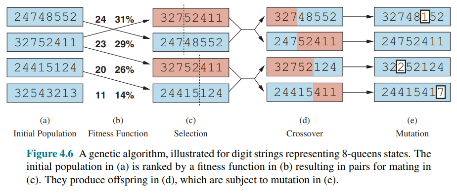 - 4.6 (a) shows the initial state of four 8-digit strings, each representing a state of the 8-queens puzzle, where the