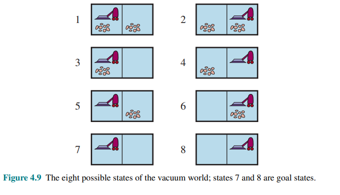 Consider the vacuum world from previous example, with eight states and three actions: right, left, and suck, and the goal is to clean up all the dirt (states 7 and 8).