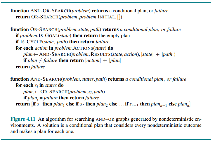 Here we see that a conditional plan can contain if–then–else steps; this means that solutions are trees rather than sequences. Here the conditional in the if statement tests to see what the current state is; this is something the agent will be able to observe at runtime, but doesn’t know at planning time. Alternatively, we could have had a formulation that tests the percept rather than the state.