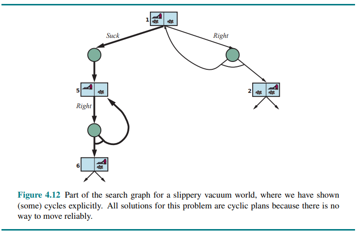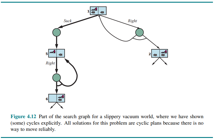 Figure 4.12 shows part of the search graph; clearly there are no longer any acyclic solutions from state 1, and AND-OR-SEARCH would return with failure. There is, however, a cyclic solution, which is to keep trying Right until it works.