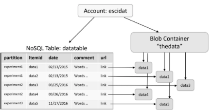- Object Store (Blob Container) is used to store data, the NoSQL table contains in the “url” column, for each row, a link the location of the data in blob container