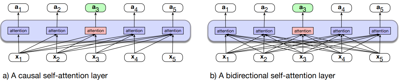 - (b) Information flow in a bidirectional attention model. In processing each token, the model attends to all inputs, both before and after the current one. So attention for token 3 can draw on information from following tokens.