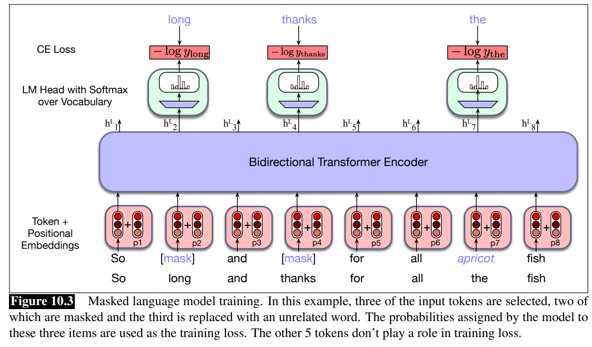 - For bidirectional masked LMs, the model tries to predict one or more words from all the rest of the words: