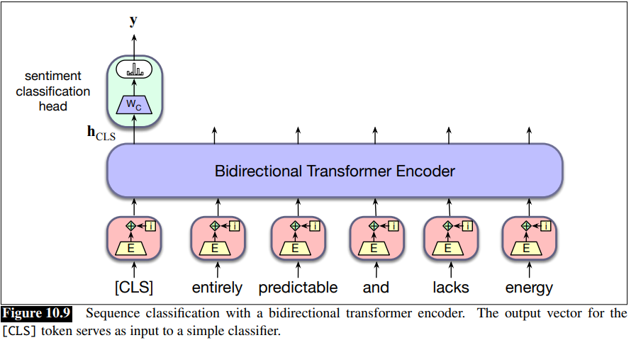 Sequence classification: the task of classify an entire sequence of text with a single label, like sentiment analysis or spam detection (see text classification). For sequence classification we represent the entire input to be classified by a single vector. For a pretrained BERT model, we add a new unique token to the vocabulary called [CLS] and propend it to the start of all input sequences, both during pretraining and encoding. The output vector in the final layer of the model for the [CLS] input represents the entire input sequence and serves as input to a classifier head, a logistic regression or neural network classifier that makes the relevant decision.