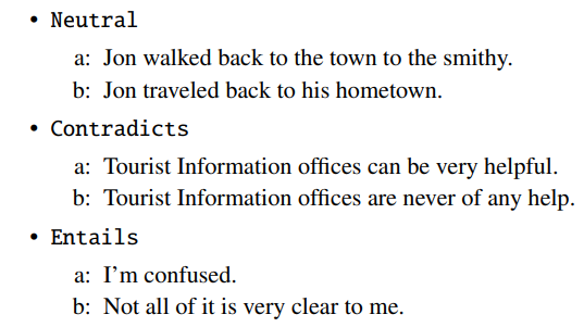 Natural Language Inference (NLI) Consider the task of natural language inference (NLI) also called recognizing textual entailment.