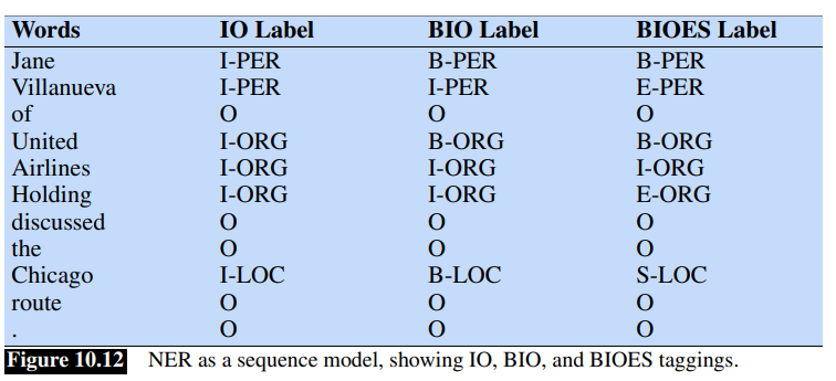 BIO Tagging Since some entities could be composed of multiple words, BIO tagging and variantes (like IO, BIOES) are used. Recall BIO tagging a token is label with B if it starts a span of interest, I if it is inside a span of interest, O at the end of it.