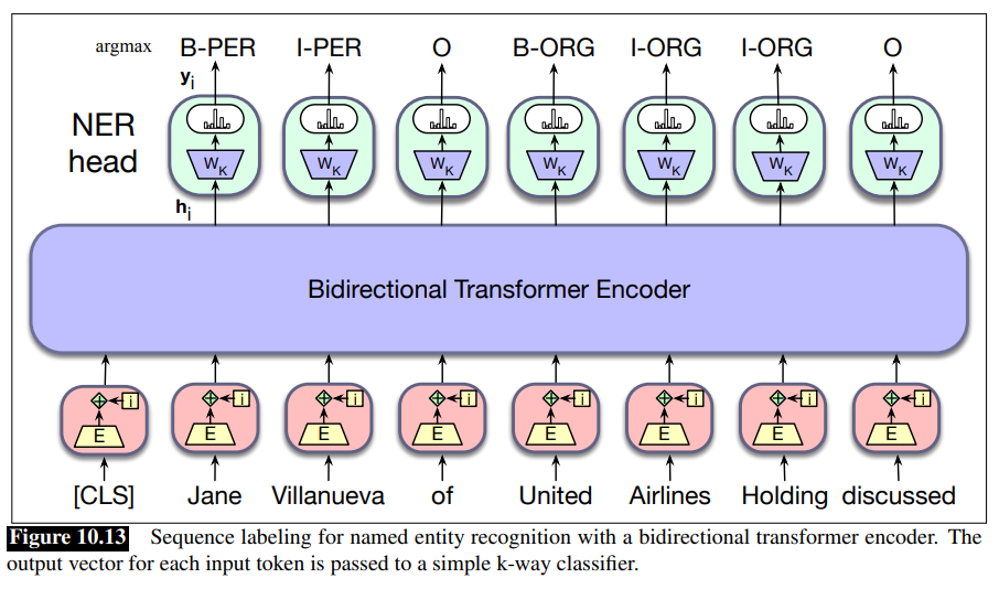 In sequence labeling, we pass the final output vector corresponding to each input token to a classifer that produces a softmax distribution over the possible set of tags.