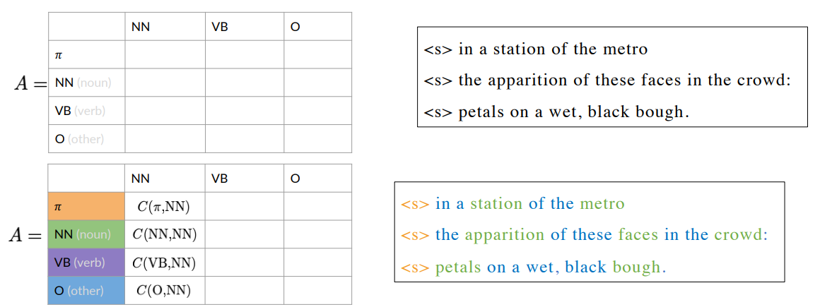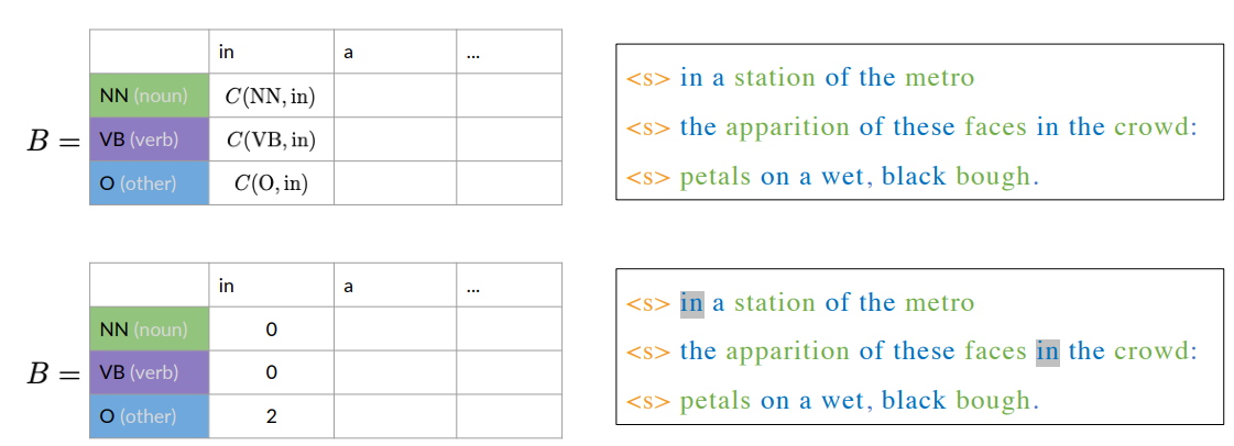 We count the co-occurrences of a POS tag with a specific word. Example: