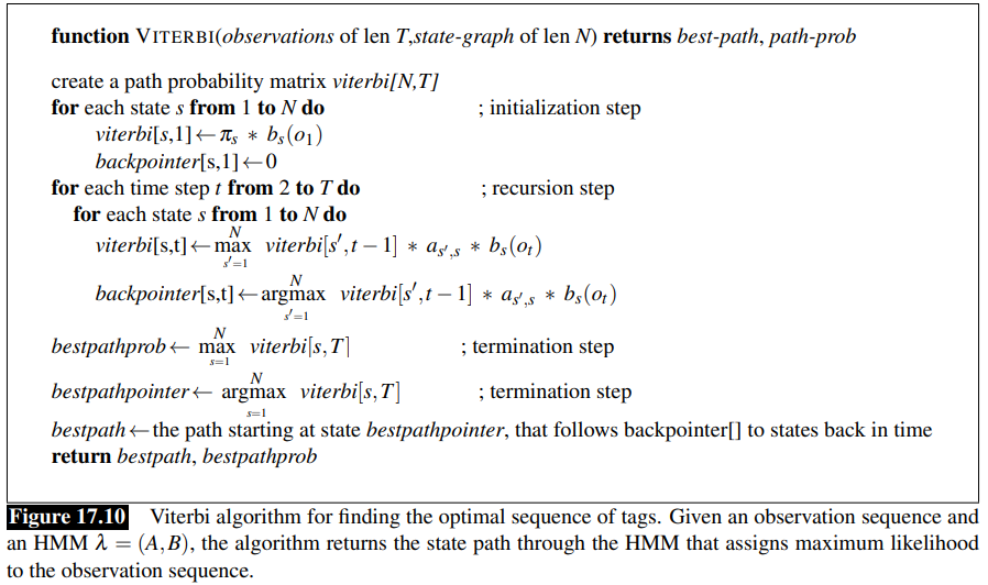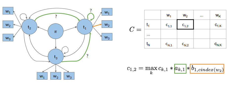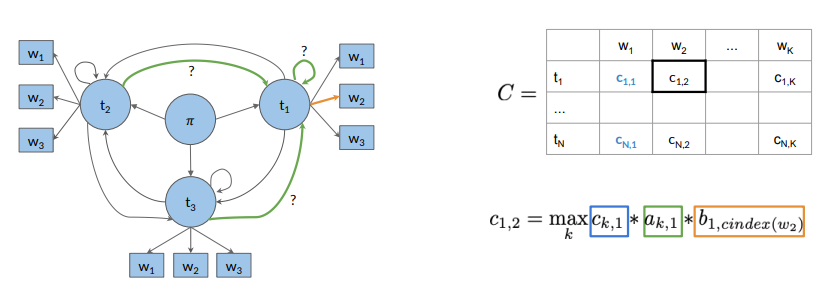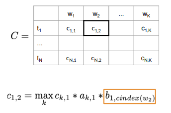 : Previous Viterbi path probability from previous time step. : transition probability value (from transition matrix) from previous state to current state : the state observation likelihood of the observation symbol given the current state .