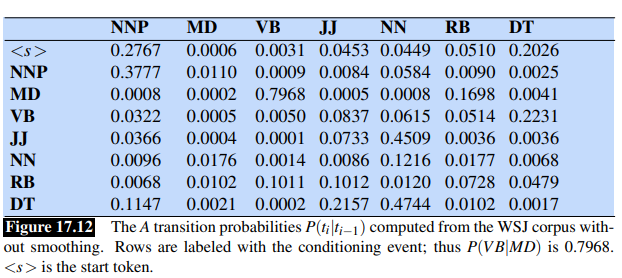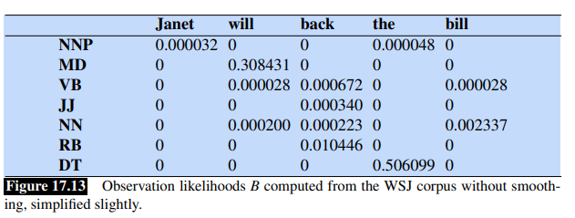 <s>and so the probability that the first word is i.e a NNP given start symbol. - Notice that most of the cells in the first column are zero since the word Janet cannot be any of those tags.