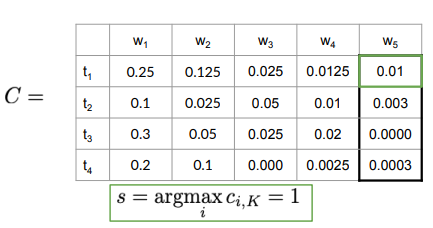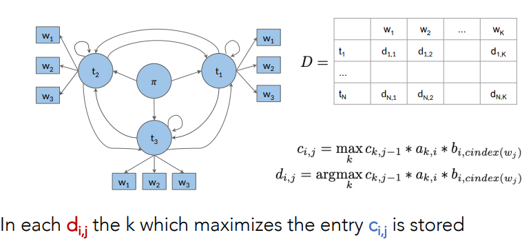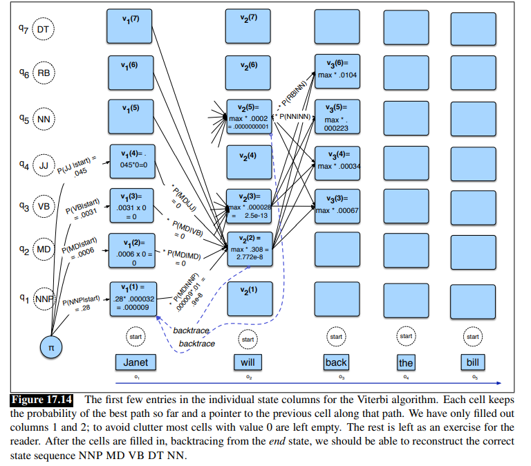 viterbi[s,t]by taking the maximum over the extensions of all the paths from the previous column that lead to the current cell according to equation (seen before) - Each cell gets the max of the 7 values from the previous column, multiplied by the appropriate transition probability; as it happens in this case, most of them are zero from the previous column.