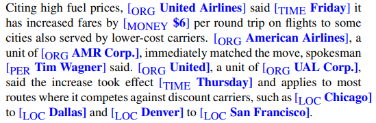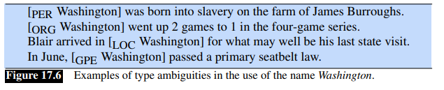 Four entity tags are most common: PER (person), LOC (location), ORG (organization), or GPE (geo-political entity).