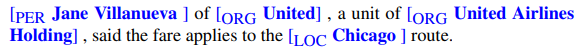 This is justified by the fact that for a named entity tagging, the entity rather than the word is the unit of response. For example, two entities “Jane Villanueav” and “United Airlines Holding” and the non-entity would count as single response.
