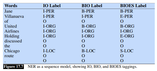 The example shows also the variants IO tagging (no B tag), and BIOES tagging with adds an end tag for the end of a span and a span tag S for a span consisting of only one word.