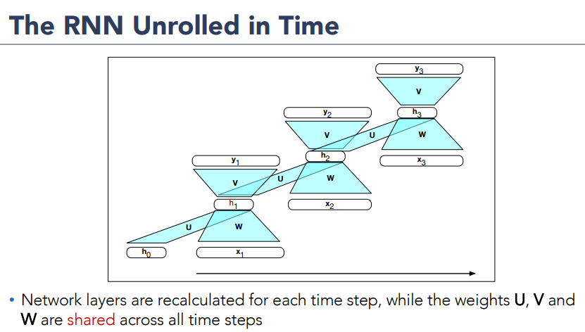 Note: however for applications that involve much longer input sequences, such as speech recognition, character-level processing, or streamining continuos inputs, unrolling an entire input sequence may not be feasible. So instead, the input is unrolled into manageable fixed-lenght segments and treat each segment as a distinct training item.