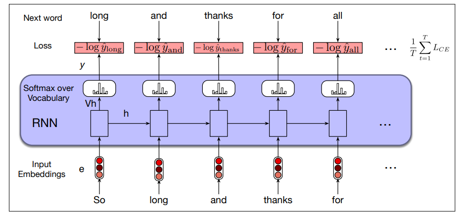 RNN as LM: process the input sequence one word at a time, attempting to predict the next word from the current word and the previous hidden state.
