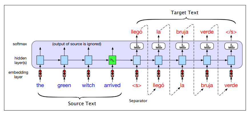 - the decoder uses the final encoder hidden state (the summary of the entire source sentence) and the sentence separator as the first inputs.
