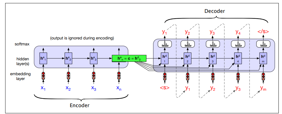 - Decoder uses context information from the encoder’s last hidden state.