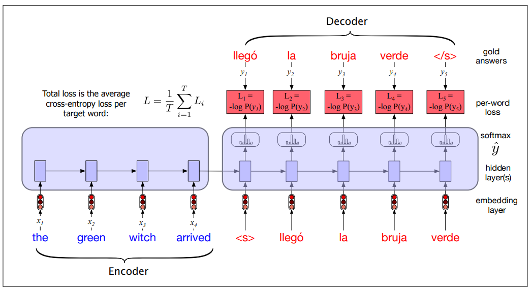 in the decoder in order to compute the loss at each token, which can then be averaged to compute a loss for the sentence. - This loss is then propagated through the deocoder parameters and the encoder parameters.