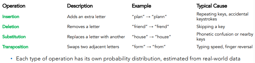 The probabilities of these operations are estimated from a corpus of spelling errors and corrections (training data).