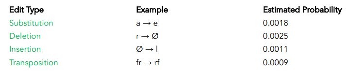 is the probability of a specific edit (e.g., deleting ‘r’, substituting ‘a’ to ‘e’)