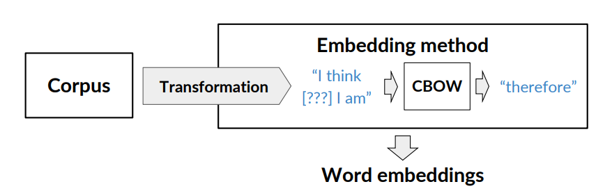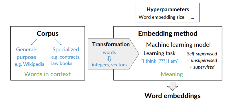 - A corpus text: as sawn in previous lesson the context of a word tells you what type of words tend to occur that specific word. The context is important as this is what will give meaning to each word embedding.