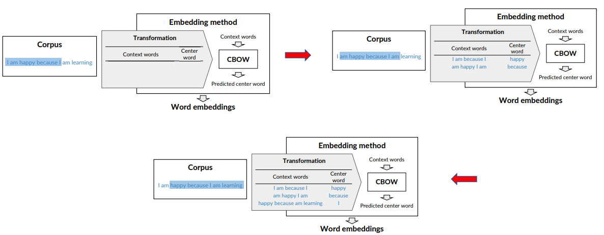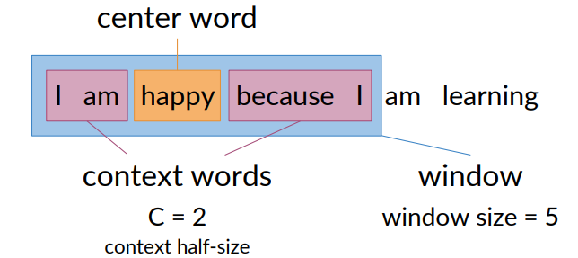In the first phase of the training i use happy as center word and i am happy because i as window. Then in the next i move the window, consider ”because” as center and so on.