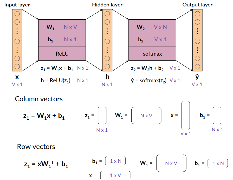 Notice that if i want like a word embedding size of 100, i need to consider h=100 nodes in the hidden layer. Input and output are of the size of the vocabulary.