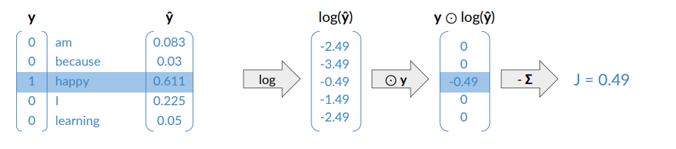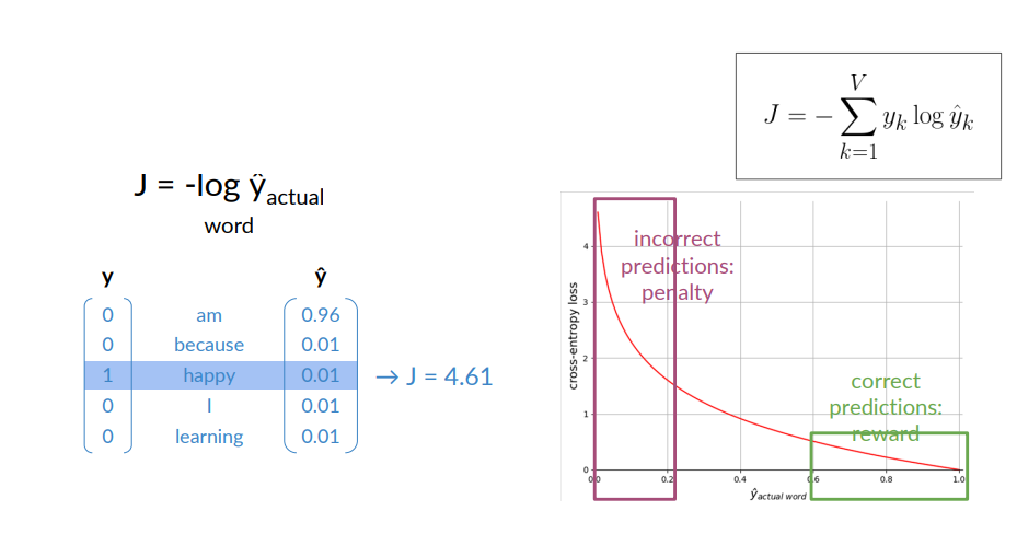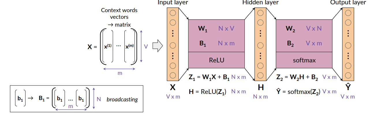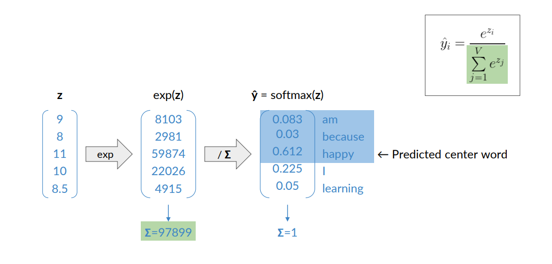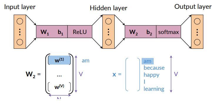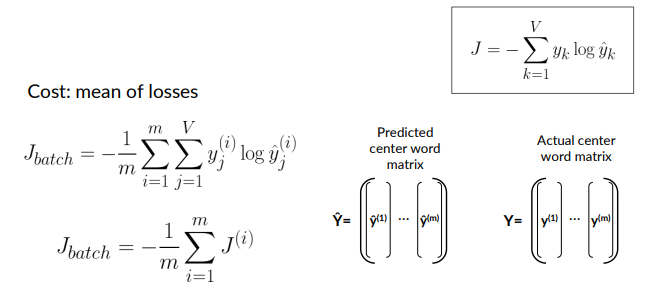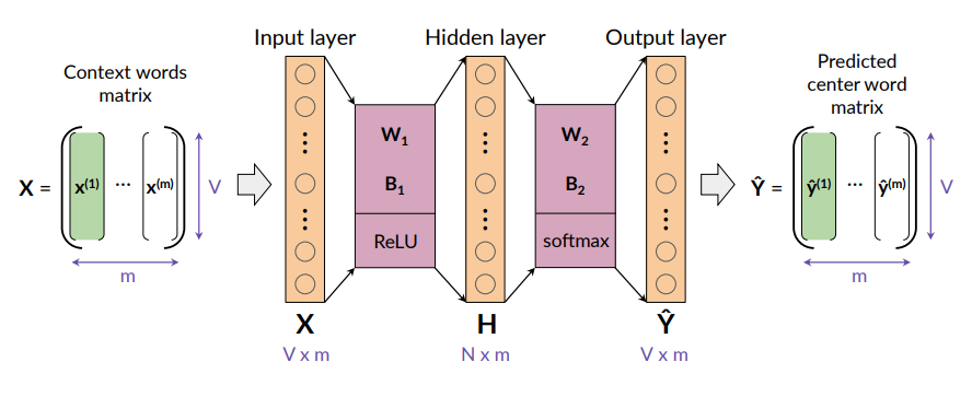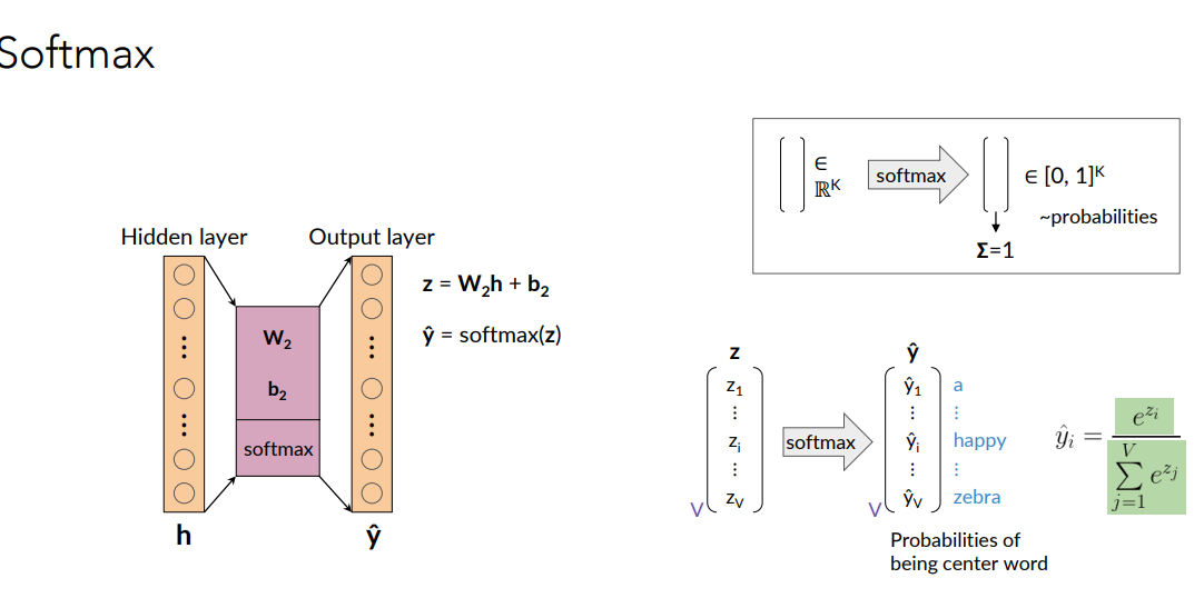 - In this way we can interpret the output vector as a probability, then we apply the softmax to this vector and obtain the predicted center word.