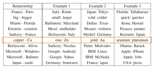 Test relationships between words, from the original Word2vec paper (word embedding created by a continuos skip-gram model):
