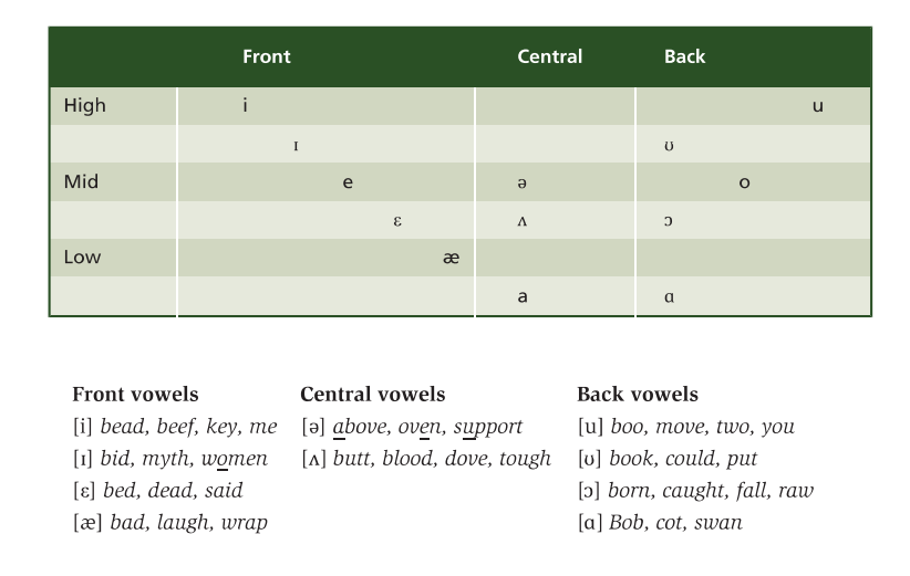 - heat and hit: “high,front” vowels because the sound is made with the front part of the tongue in a raised position