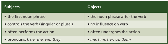 - The noun phrases describe the roles of entities (people and things) involved in the action.