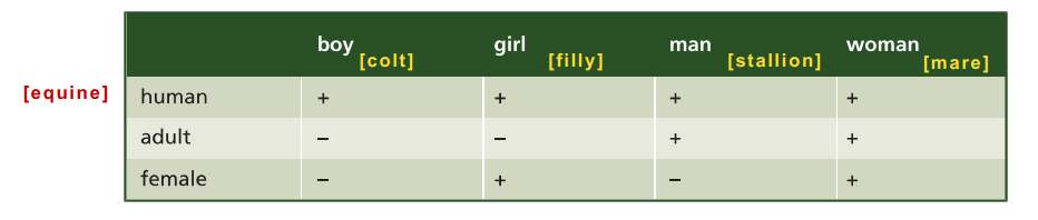 Features such as [+human] or [+adult] can be treated as basic elements or components of meaning in the approach called componential analysis.