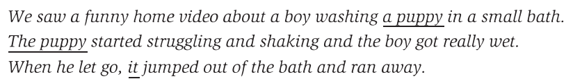 We usually make a distinction between how we introduce new referents (a puppy) and how we refer back to them (the puppy, it)