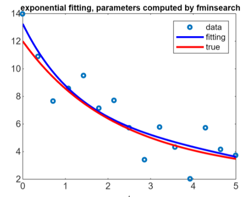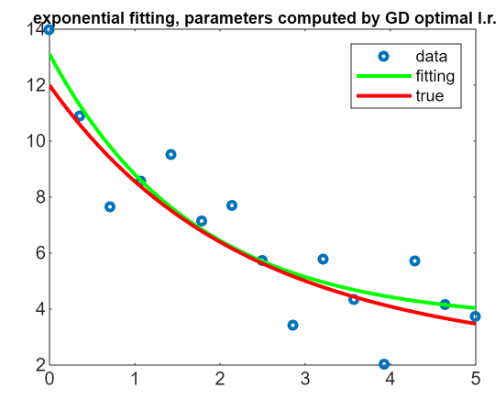 The true goal of this method is not to compute the exactly true line, the exponential with the true parameters choosen at the beginning (in the example):
