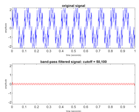 We may construct this filter using an approach known as filter cascading or filter stacking. In essence, the high-pass filter is sequentially applied to the input signal to remove low-frequency component. Then we do the same thing with the low-pass filter to remove high frequency components.