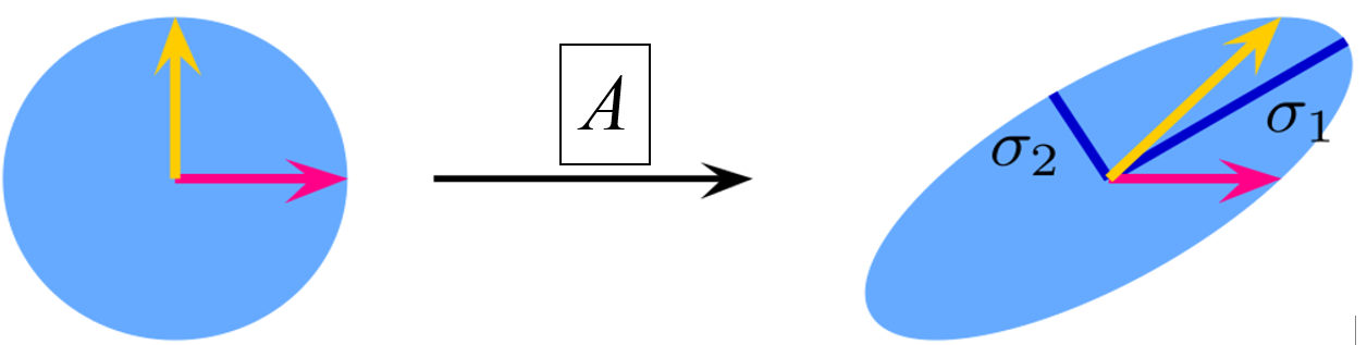 To these infinite vectors we apply a matrix A which produces the effect on the right. And we obtain an elipsoid (important note: it relates to the singular vector of matrix A).
